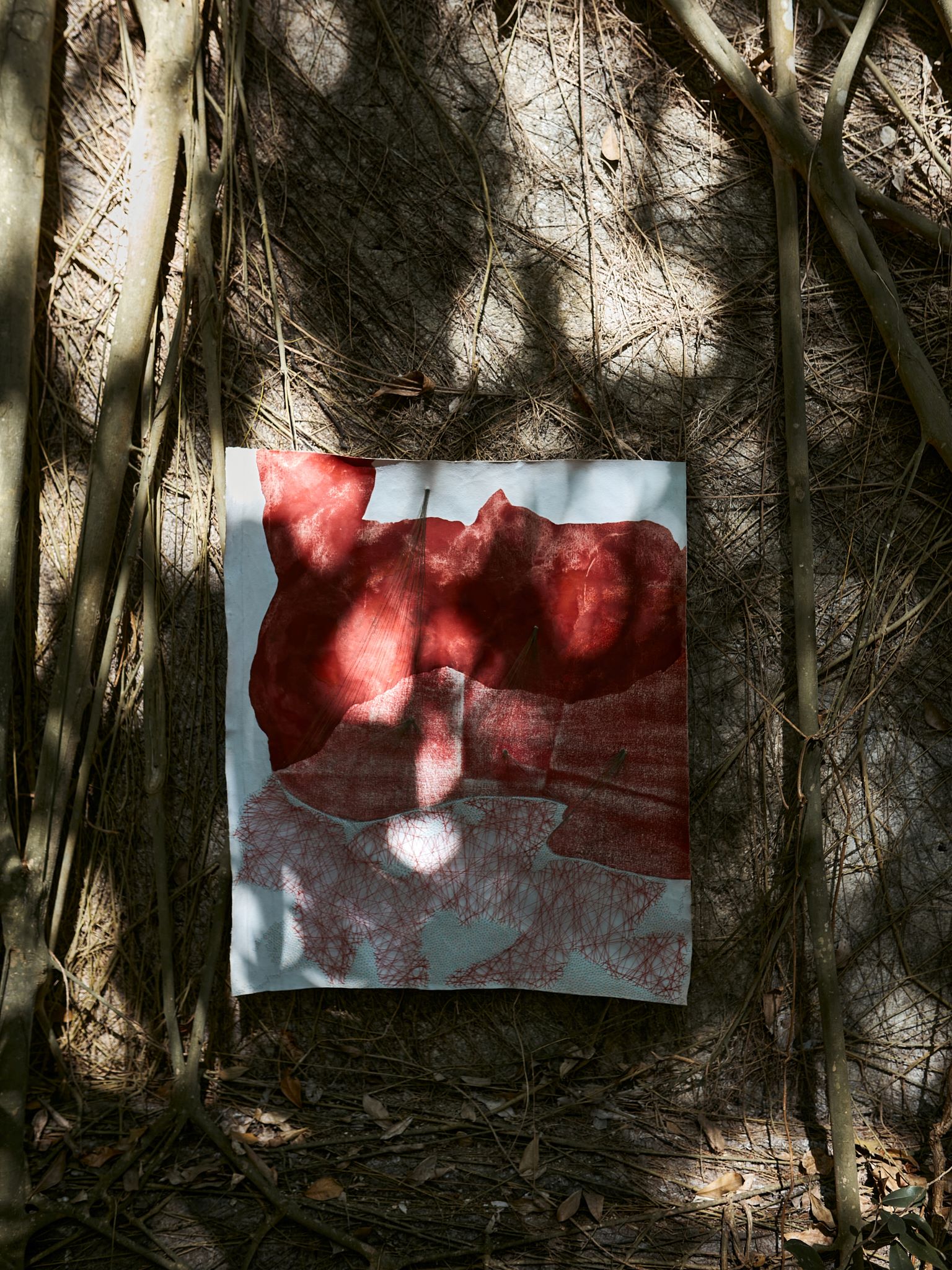 The resulting large scale photographs accompany the original works here. Each image records these exchanges: art and landscape as co experiencers, momentarily unified in breath and light. The outdoor environments experienced by the works, and vice versa, grounding the energetic system of the paintings within the planetary one.