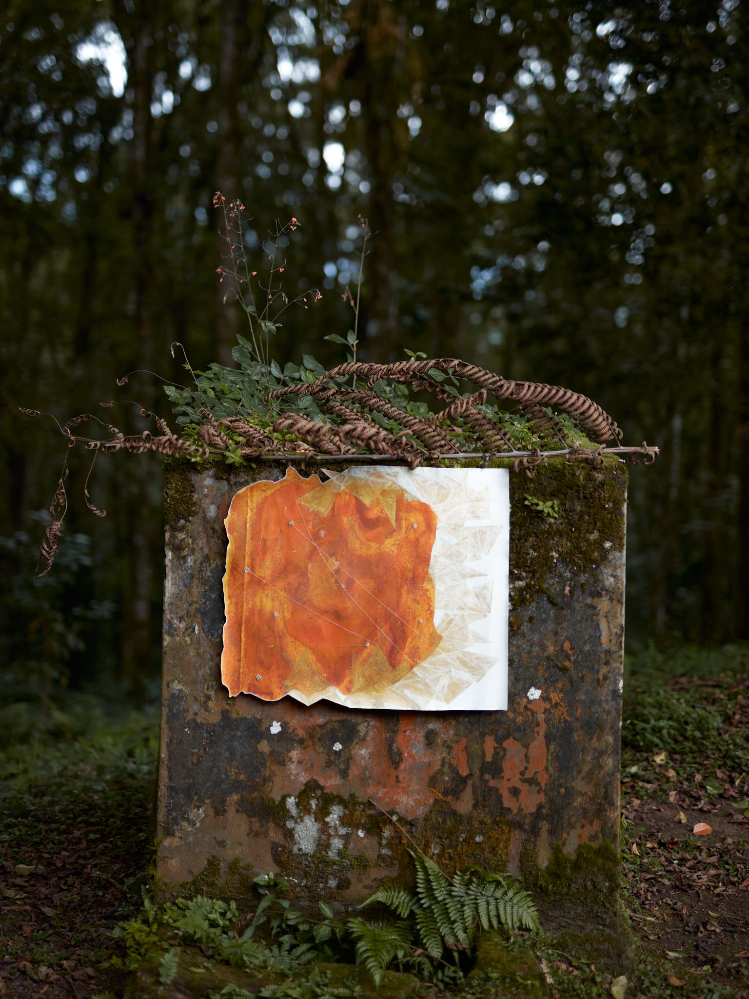 Today, her materially rich works reflect a sustained dialogue between material, time, and perception, unfolding at the pace of presence. She is most often found in the mountains or woodlands of Europe and Asia, where she dwells and draws from the elemental rhythms of her surroundings.